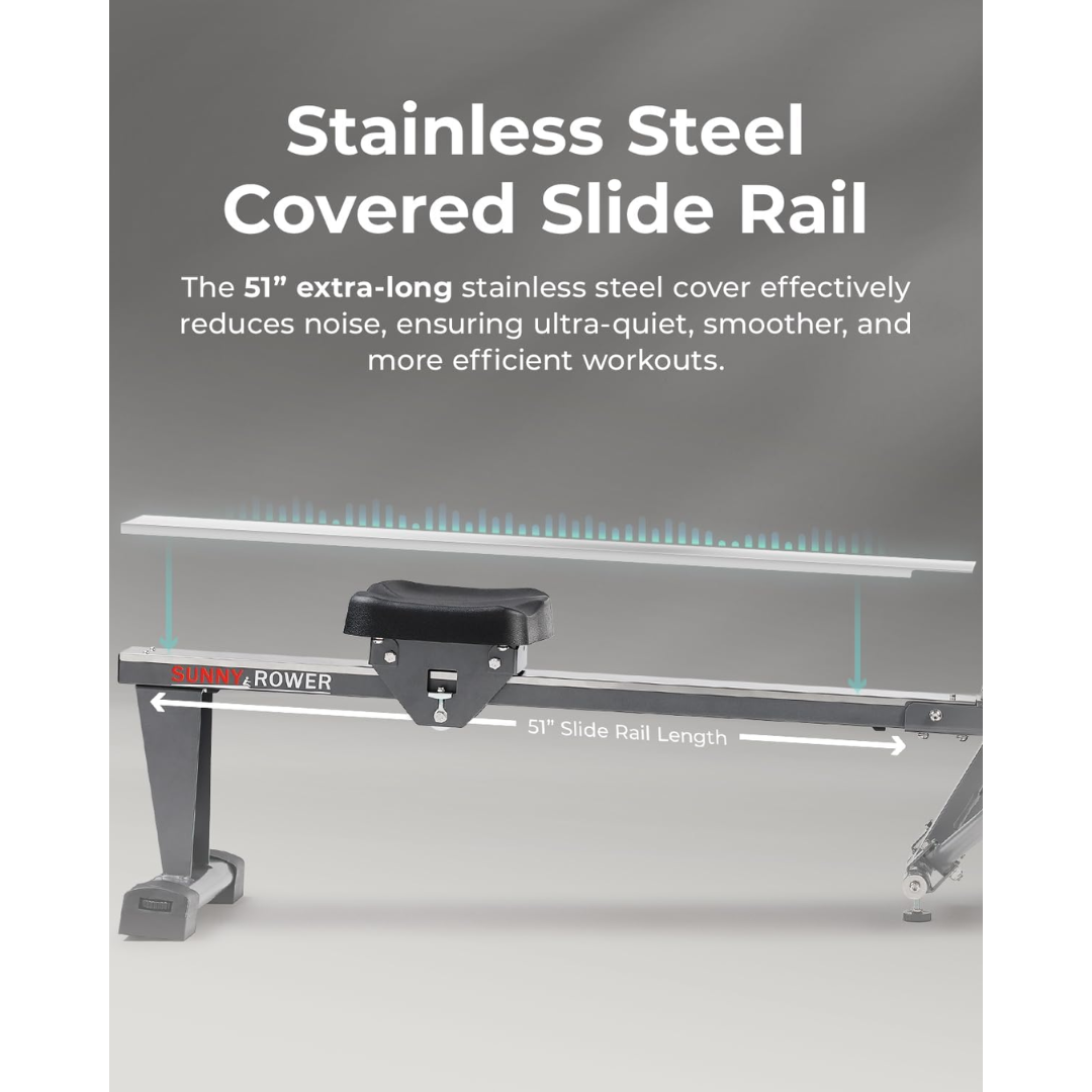 Equipped with a stainless steel rail cover, this rowing machine ensures smooth, silent operation, making it perfect for use in shared spaces or while watching TV. The 51.3-inch rail enhances performance, providing a seamless glide with every stroke.