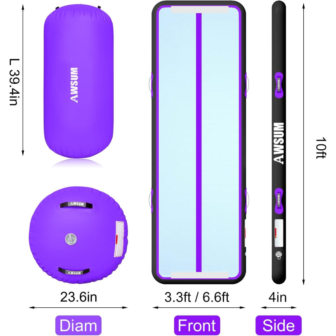 This set includes a 10ft x 3.3ft x 4in mat in purple/black and an air roller with a diameter of 23.6in (length 39.4in) in purple. Its design emphasizes ease of transport and operation, though some users have expressed wishes for better air retention, a higher quality pump, and improved carrying bag options for even greater convenience.