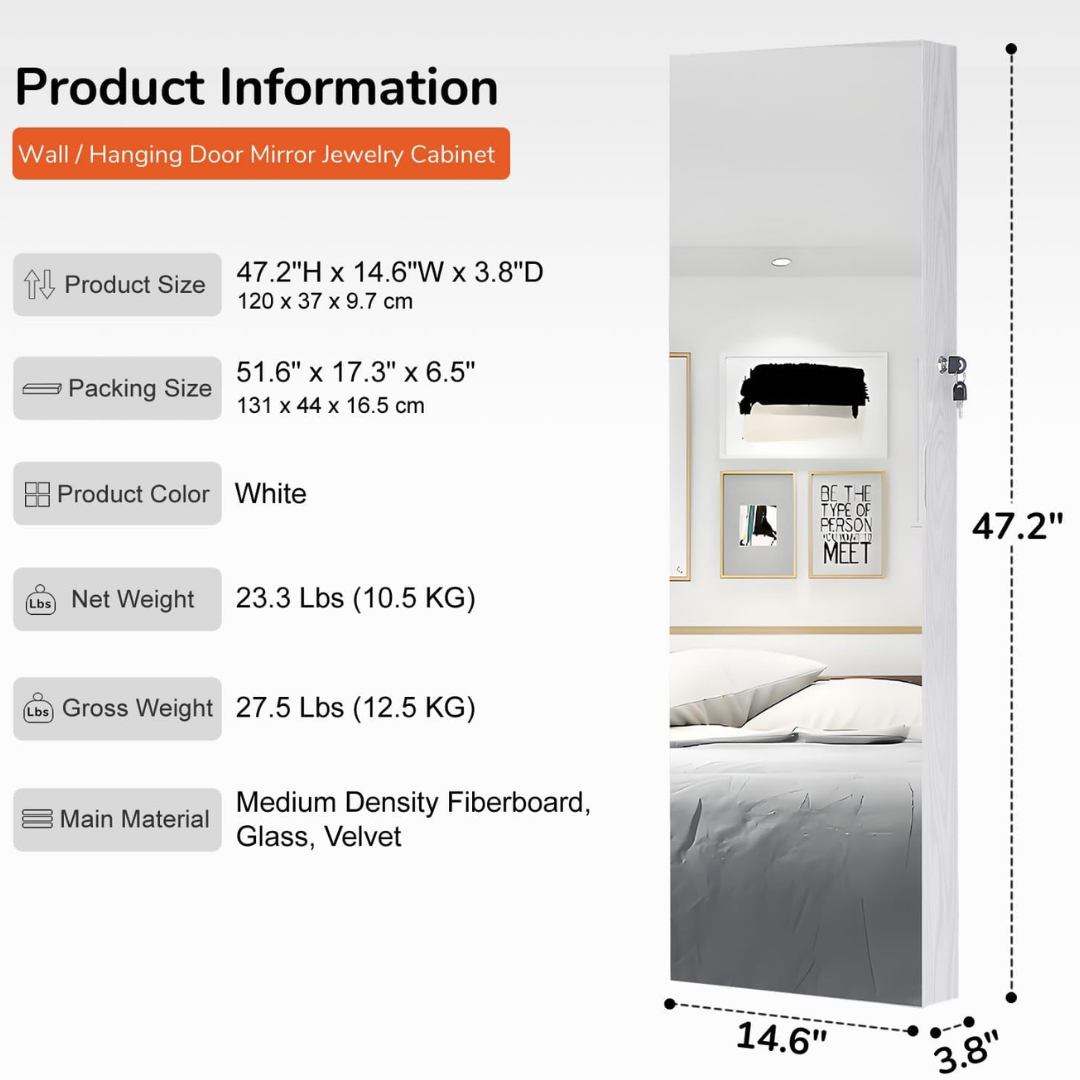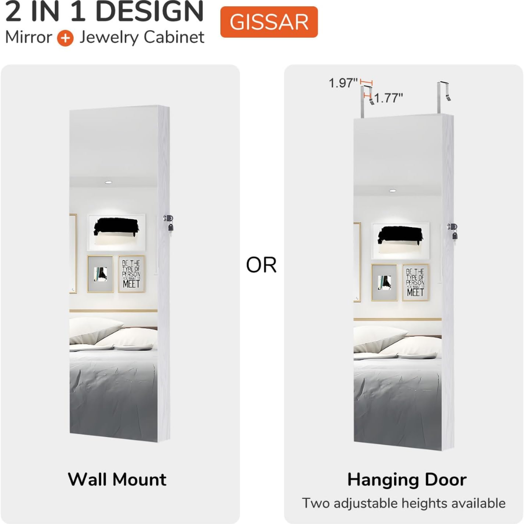 Keep your jewelry organized and easily accessible with this 2-in-1 Mirror Jewelry Cabinet. Designed for both wall and door mounting, it features a full-length mirror, spacious storage, and a secure lock, making it a stylish and functional addition to any space.