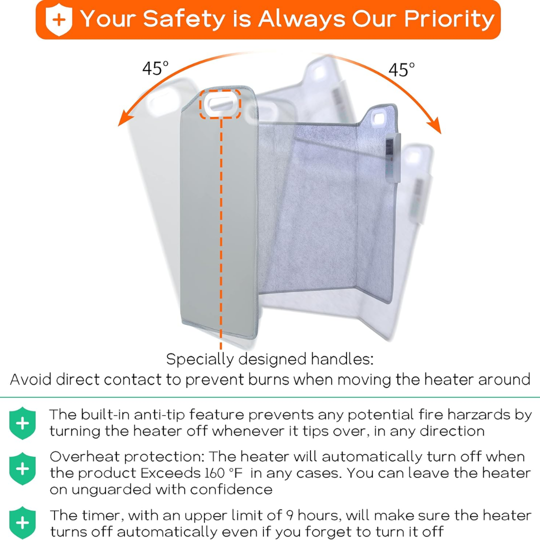 Electric Foot Warmer: Radiant, flameless heating provides a safe, cozy warmth with adjustable heat levels up to 160°F. Child and pet-friendly!