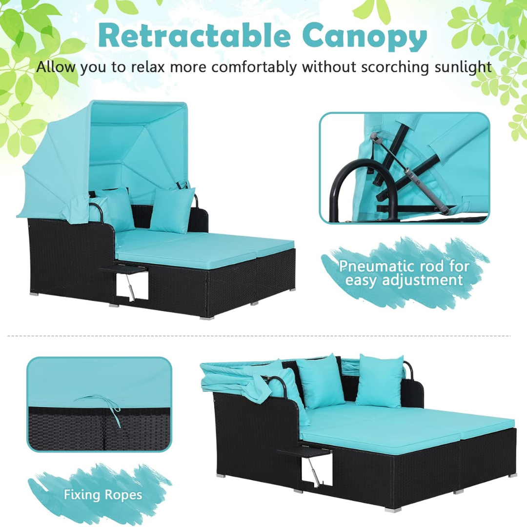 Retractable Canopy: The adjustable canopy provides shade from direct sunlight, using a pneumatic rod system for smooth operation. Fixing ropes keep it secure when retracted.